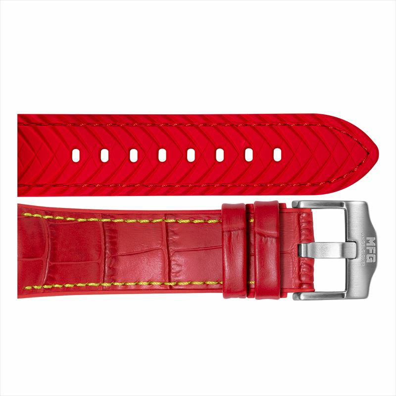 ストラップは汗や水濡れに配慮したハイブリッドベルト。表面にカーフレザー、裏面にシリコン圧着した人気の仕様です。