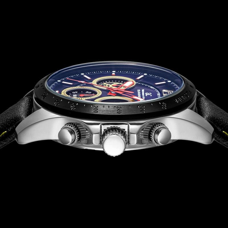 グッと引き締まったブルーをベースに、赤のインデックス、黄色のサブダイヤルといった、まさに筋骨隆々なマッスルフォームを彷彿とさせるデザインに。