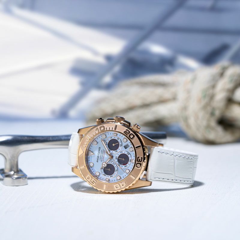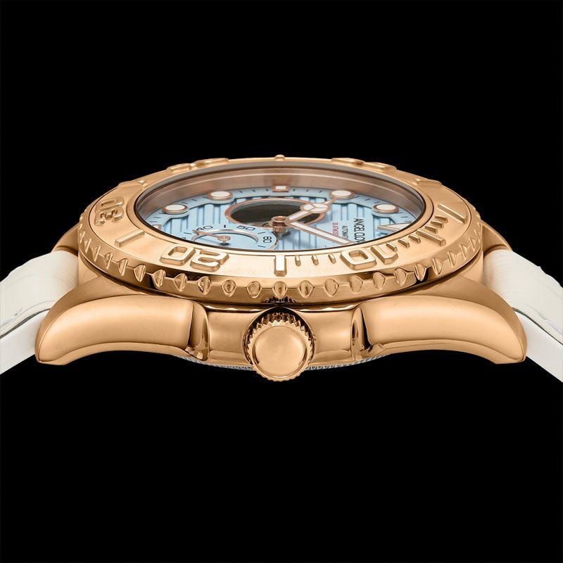 眩い輝きを放つブルーダイヤル×ゴールドの配色が目を引く、まるでビーチリゾートにいるかのような空気感を纏ったモデルです。