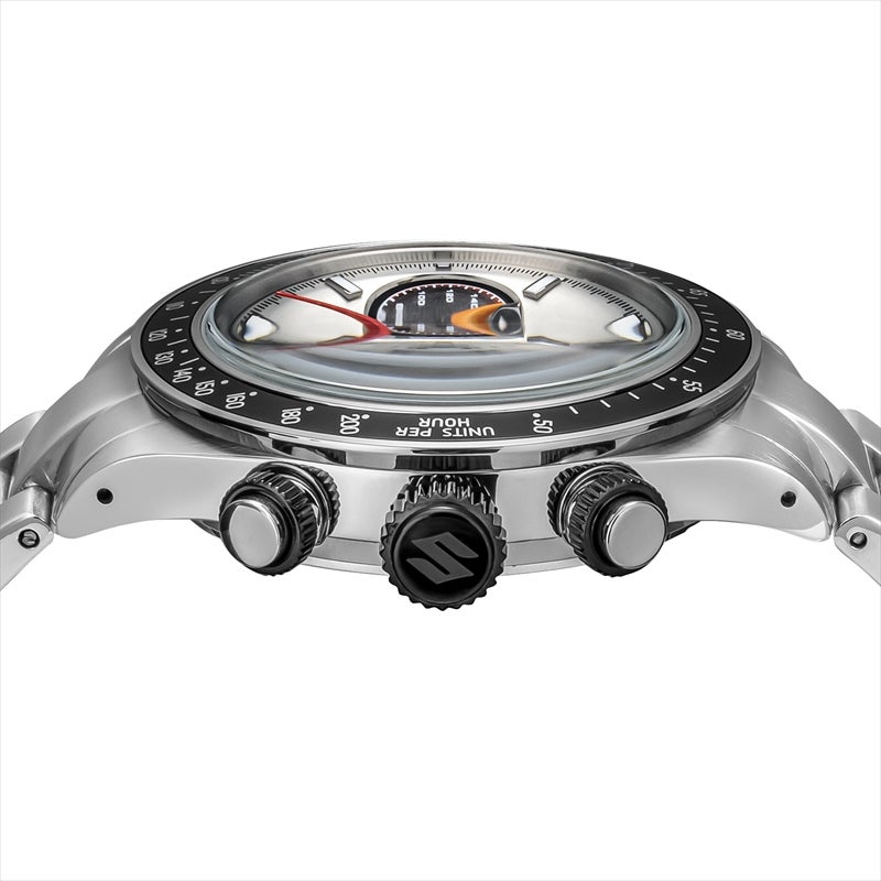 SUZUKI GSX750Sをモチーフにした孤高のデザイン。秀吉の愛機である「SUZUKI GSX750S(カタナ)」をモチーフにデザインを構築。文字盤やインデックスには、バイクのメーターをイメージしたディテールを随所に採用し、作品の世界観をリアルに表現しました。無骨でありながらもカリスマ性を放つそのフェイスデザインは、まさに「愛機を身につける」感覚を味わえます。