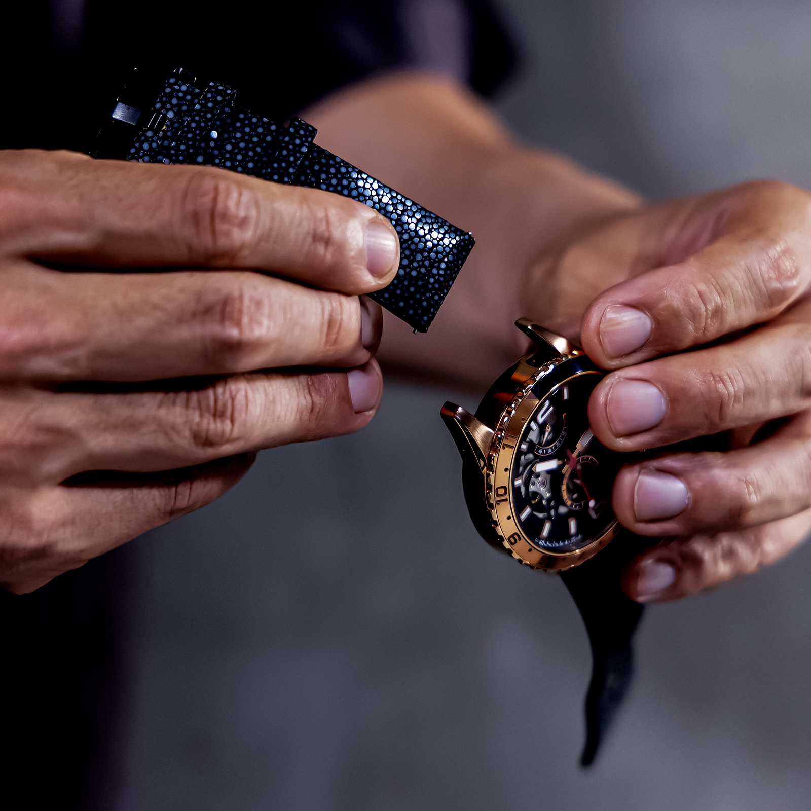 ガルーシャ(エイ革)、レザー&ラバー、ファブリックの3種ストラップが付属。