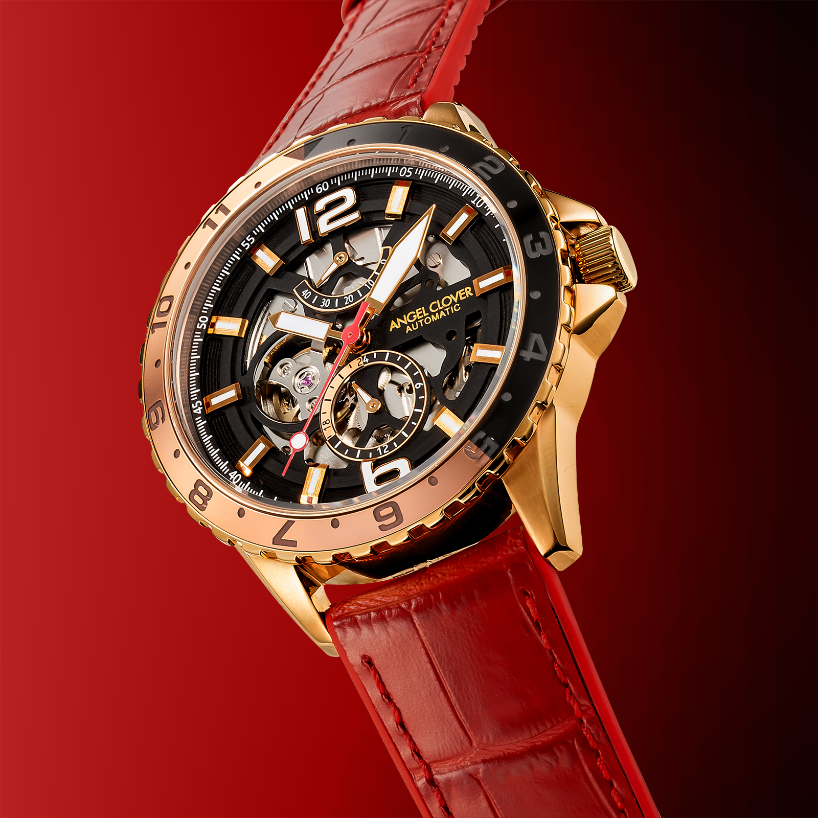 個性が異なるレッドレザー&ラバー、ブラックガルーシャ、カーキナイロンの3種ストラップ。日々のコーディネートやシーンに合わせて、付け替え可能。