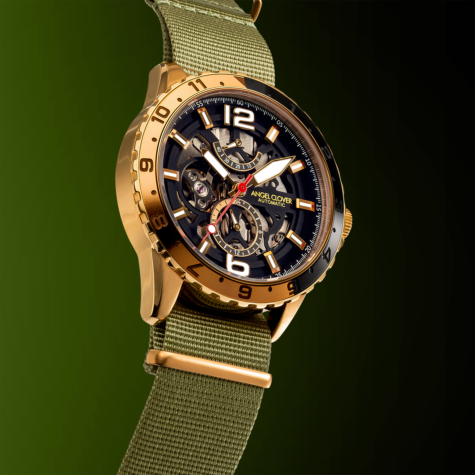 アウトドアや日常でガシガシ使えるカーキのファブリックストラップ。ひき通しタイプので、暑い季節にも裏蓋が肌に直接触れるのを抑え、ワイルドで涼し気な夏スタイルを実現します。