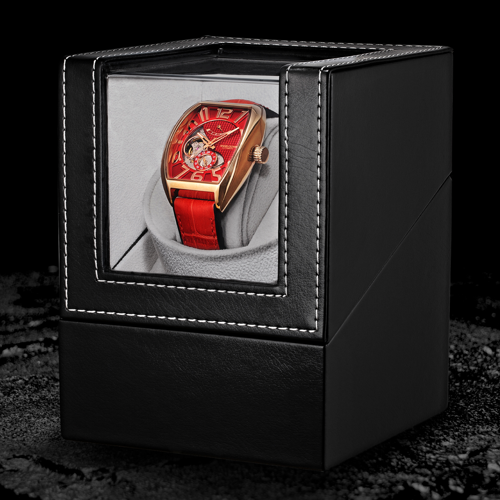 ANGEL CLOVERの機械式時計を長くご愛用頂けるよう、機械式時計のゼンマイを巻き上げてくれる、ワインディングマシーンをプレゼント。「自動巻き上げ機」とも呼ばれ、着用していない間に針が止まってしまうことを防いでくれます。久しぶりに着用しようと思ったときにも、数分前にワインディングマシーンのスイッチを入れればゼンマイを巻き上げてくれます。