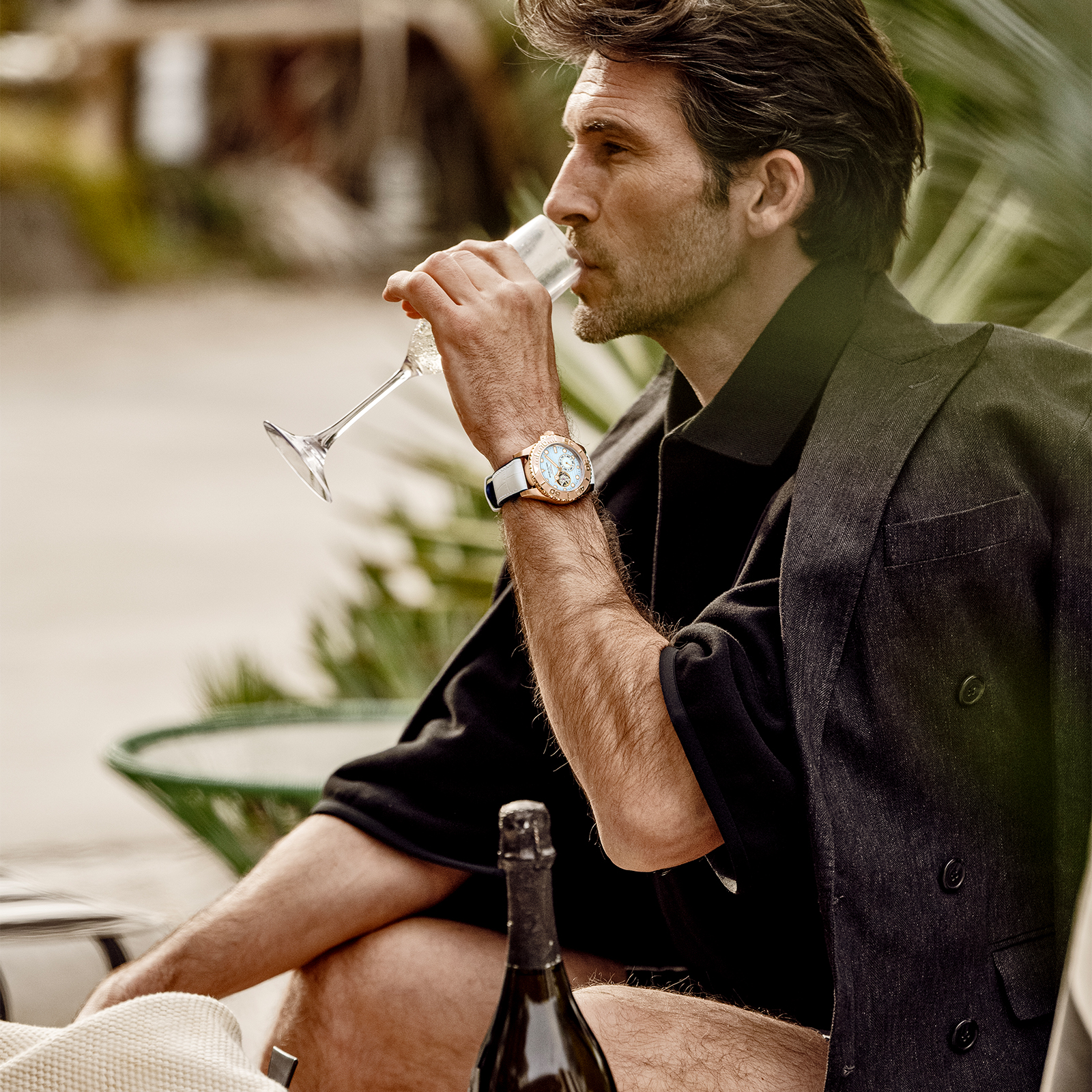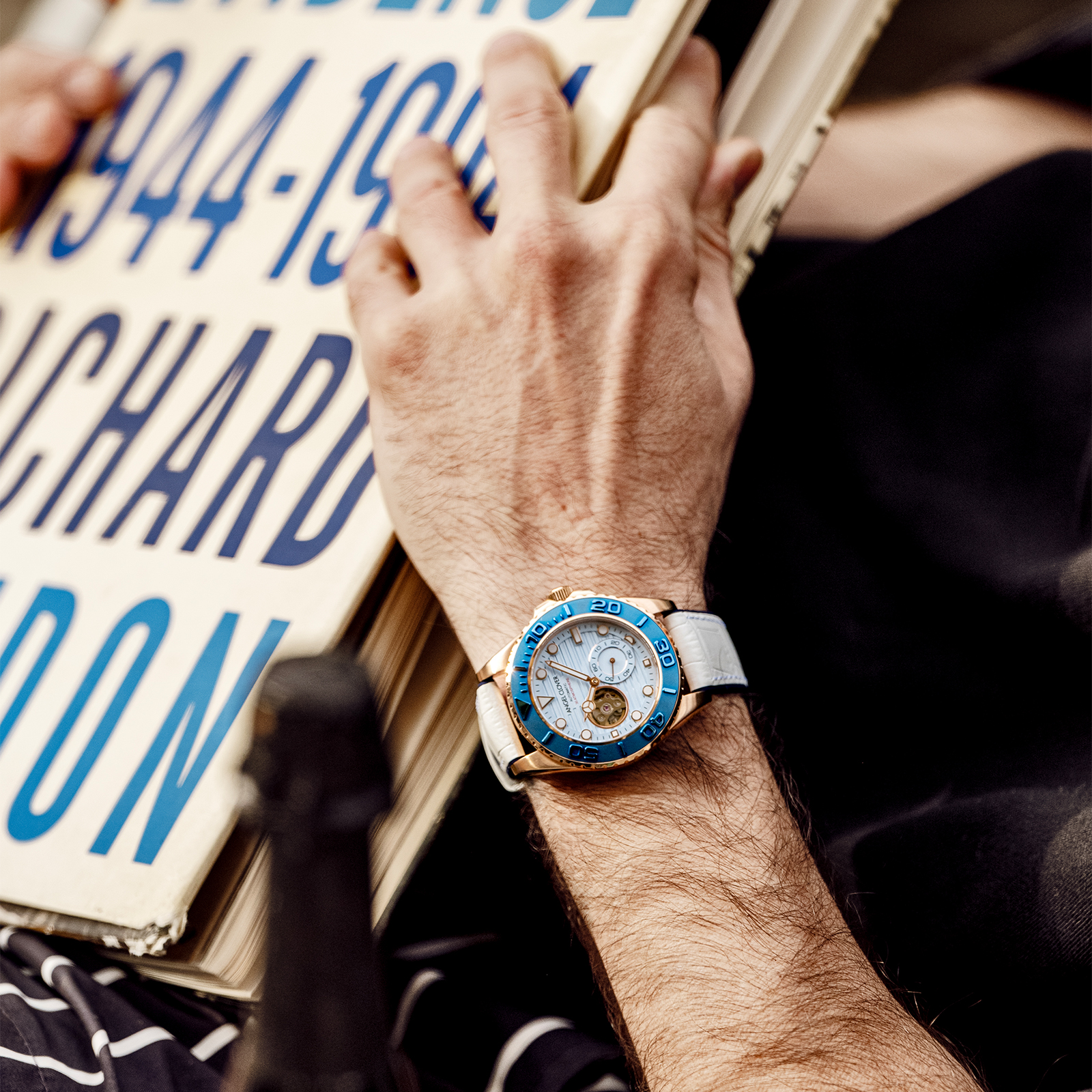 眩い輝きを放つブルーダイヤル×ゴールドの配色が目を引く、まるでビーチリゾートにいるかのような空気感を纏った新モデル。