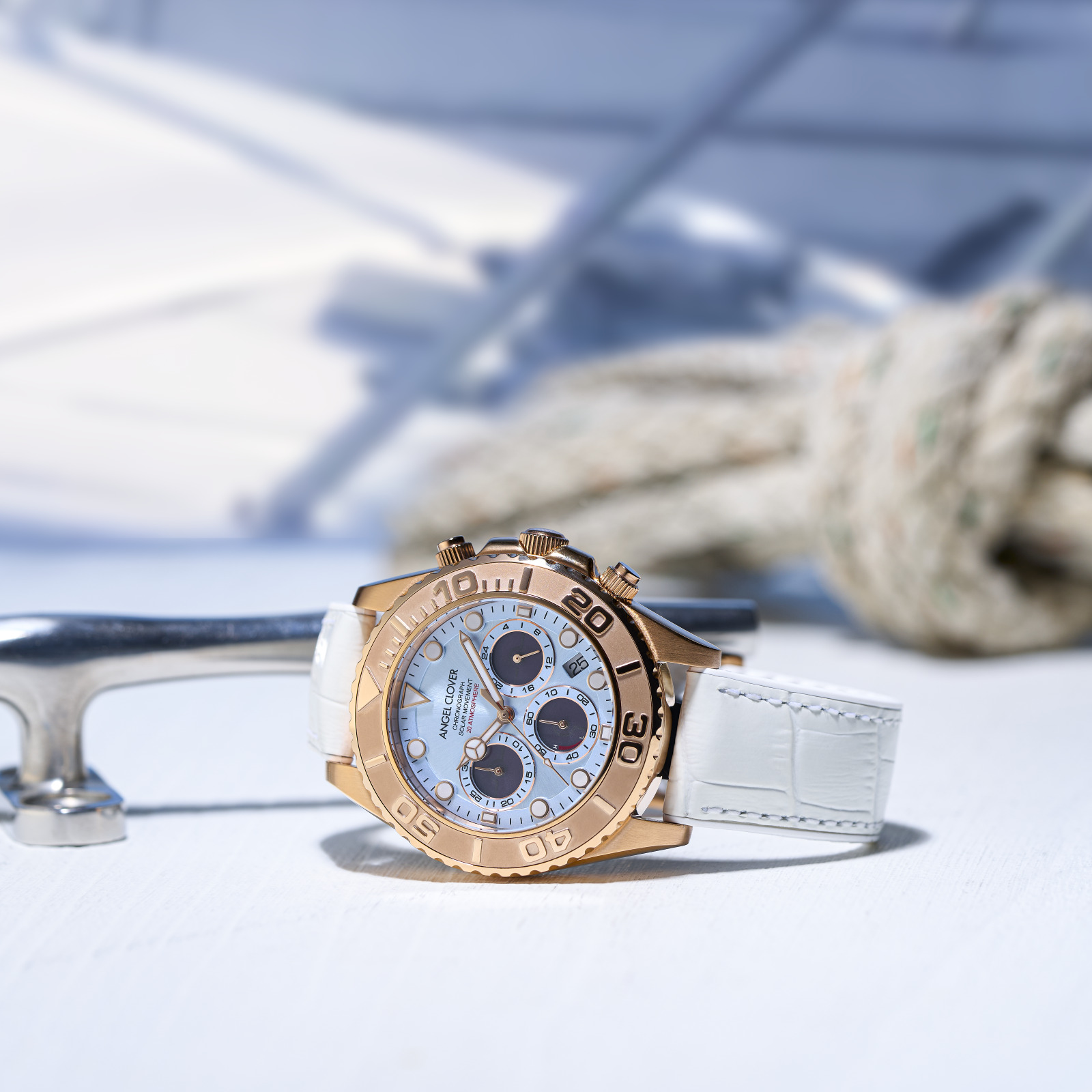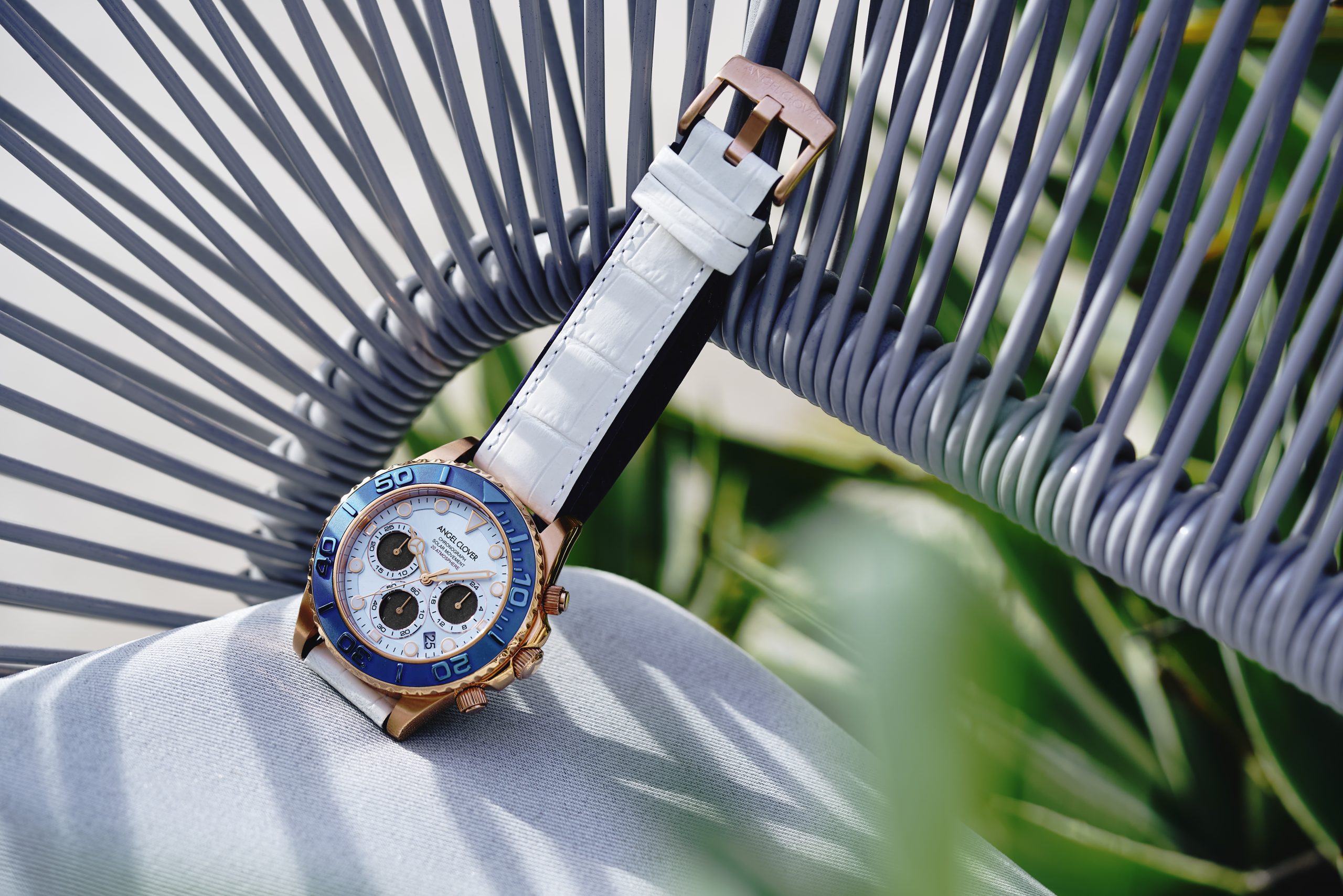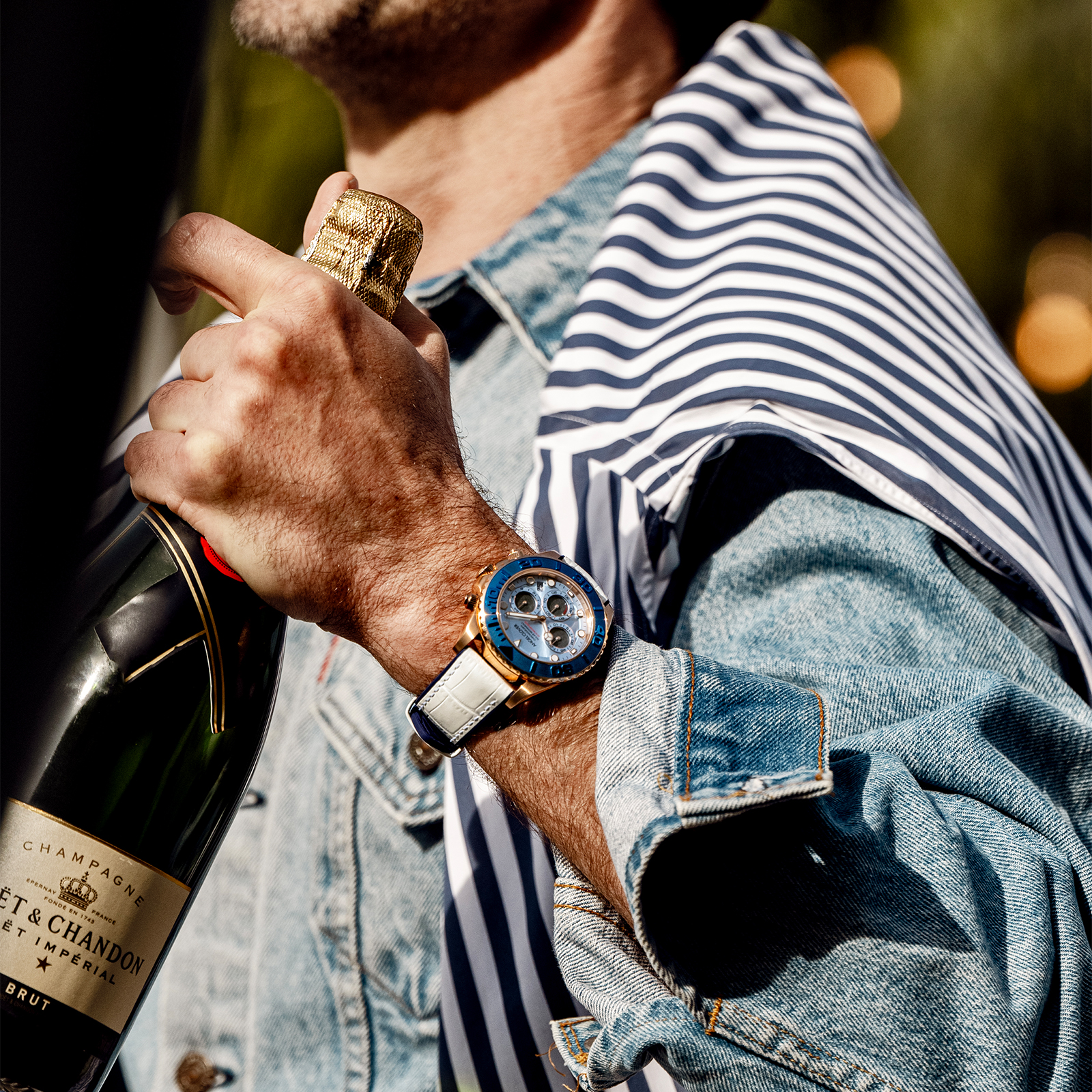 ブルーベゼルもゴールドベゼルも文字盤の淡いブルーと相まって、ときに力強く、ときに爽快な夏のスタイルアップを叶えてくれる。